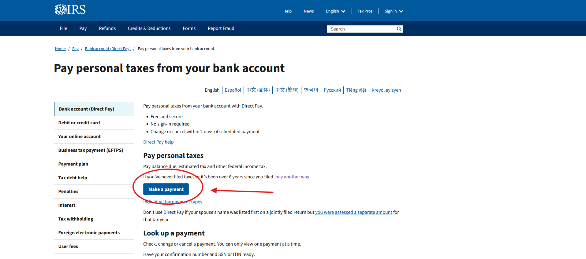 Go to irs.gov/payments/pay-personal-taxes-from-your-bank-account. This is the official IRS site, and the service is free. There's no account to create and no third-party fees. Click the blue "Make a Payment" button to begin.